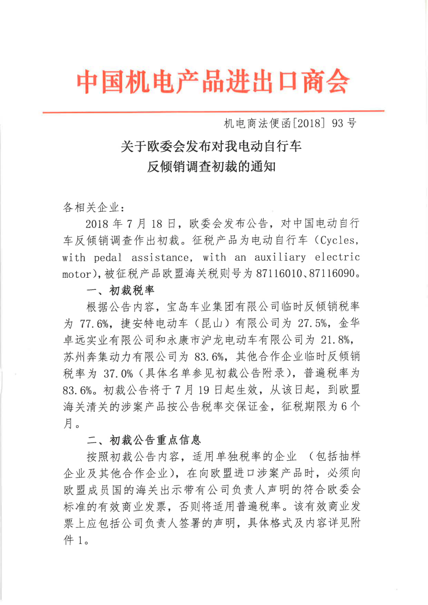 关于欧委会对我电动自行车反倾销调查初裁的通知