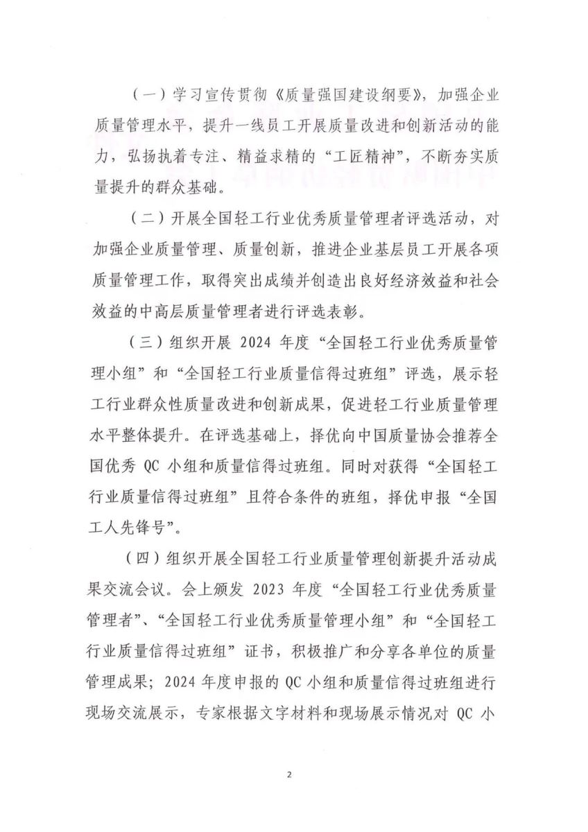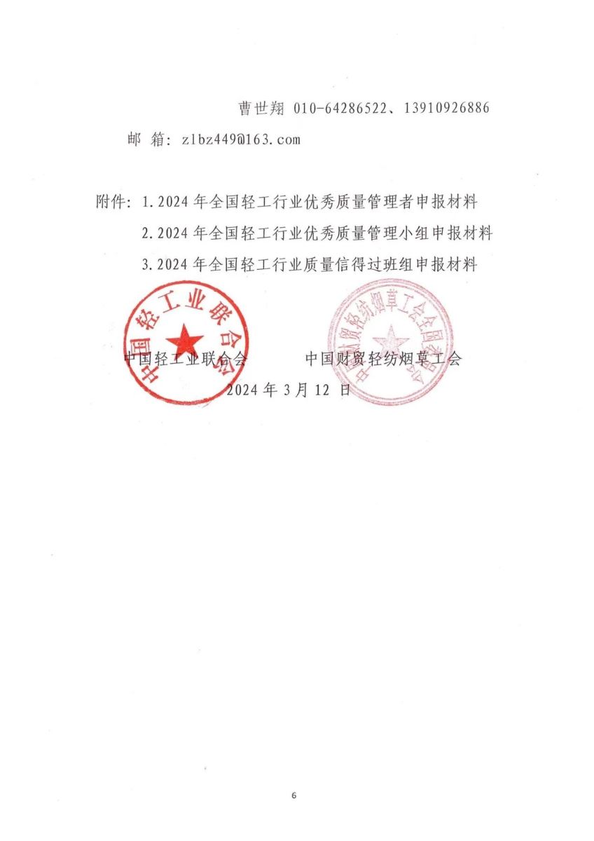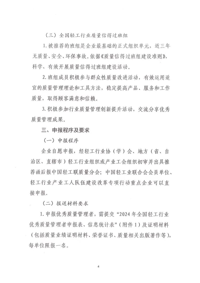 关于组织申报2024年度全国轻工行业质量管理创新提升活动的通知 来源:中自协 作者:技术标准部 发布时间:2024-03-20 10:33 附件:1. 2024年全国轻工行业优秀质量管理者申报表 2. 2024年全国轻工行业优秀质量管理小组申报表 3. 2024年全国轻工行业质量信得过班组建设典型经验申报表