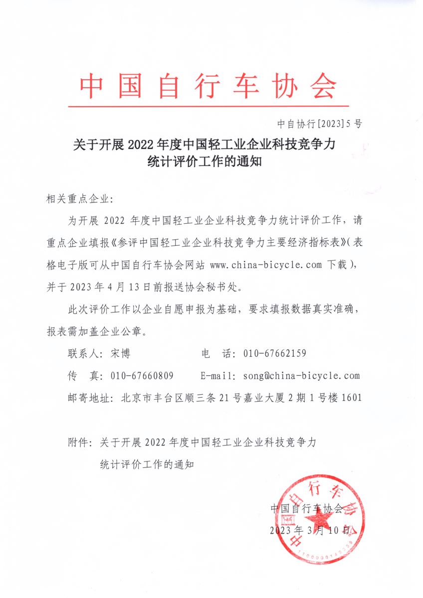关于开展2022年度中国轻工业企业科技竞争力统计评价工作的通知 来源:中自协 作者:行业发展部 发布时间:2023-03-10 16:48 附件:1、关于开展2022年度中国轻工业企业科技竞争力统计评价工作的通知 2、2022年科技百强申报表