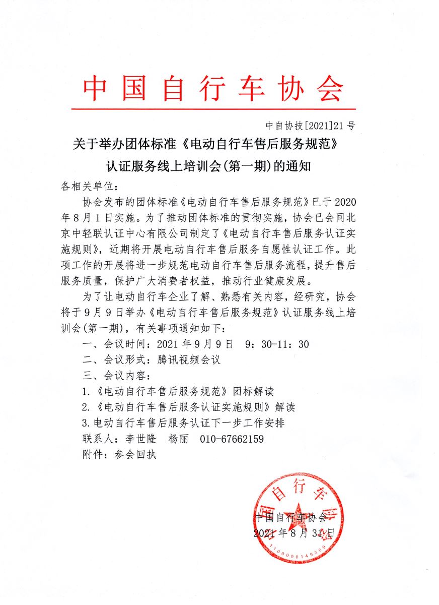 关于举办团体标准《电动自行车售后服务规范》 认证服务线上培训会(第一期)的通知