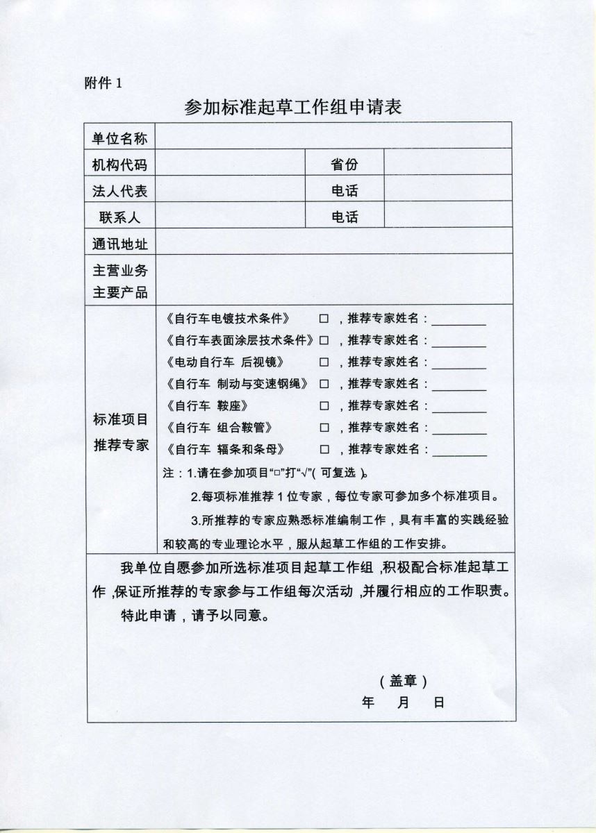 关于征集《电动自行车 后视镜》等七项行业标准制修订起草工作组成员单位的通知