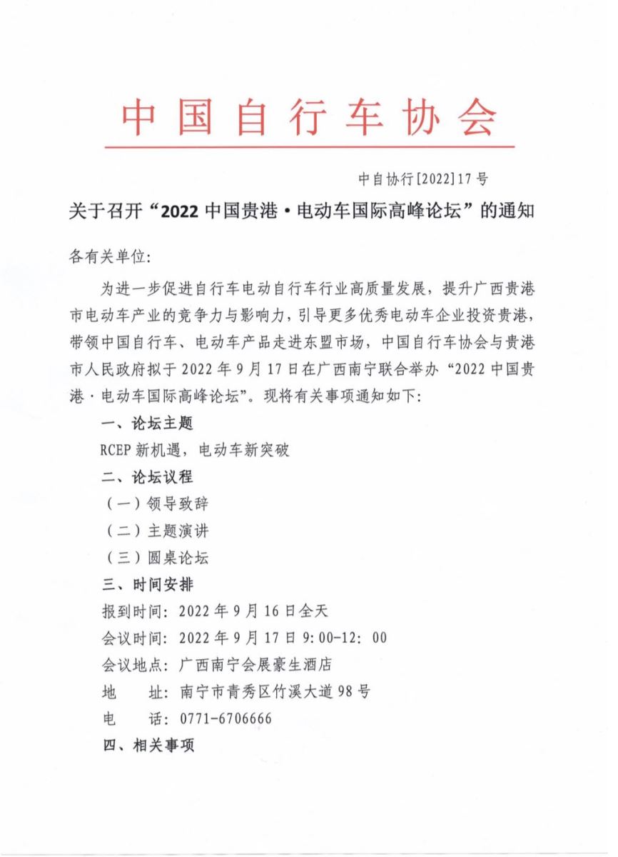关于召开“2022中国贵港·电动车国际高峰论坛”的通知