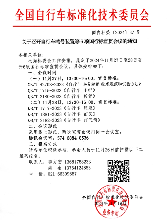 关于召开自行车鸣号装置等6项国行标宣贯会议的通知