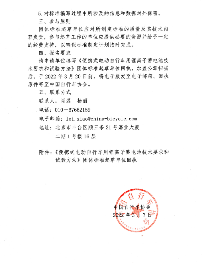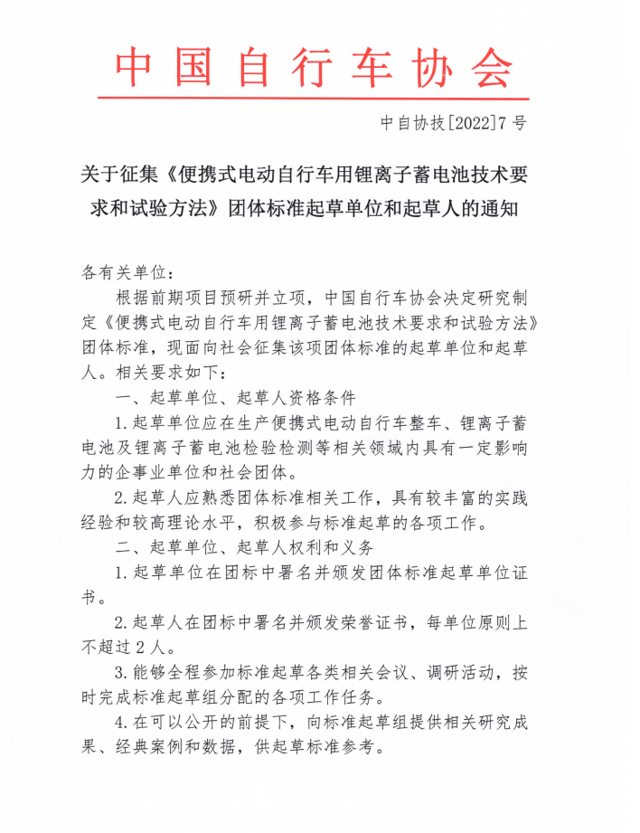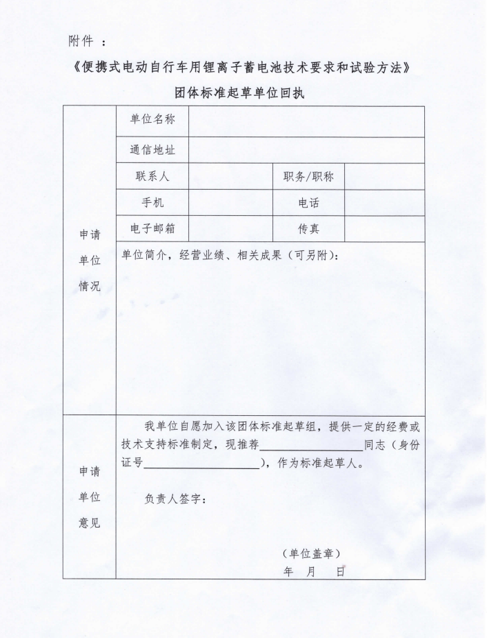 关于征集《便携式电动自行车用锂离子蓄电池技术要求和试验方法》团体标准起草单位和起草人的通知 来源:中自协 作者:技术标准部 发布时间:2022-03-07 10:14 附件:《便携式电动自行车用锂离子蓄电池技术要求和试验方法》团体标准起草单位回执