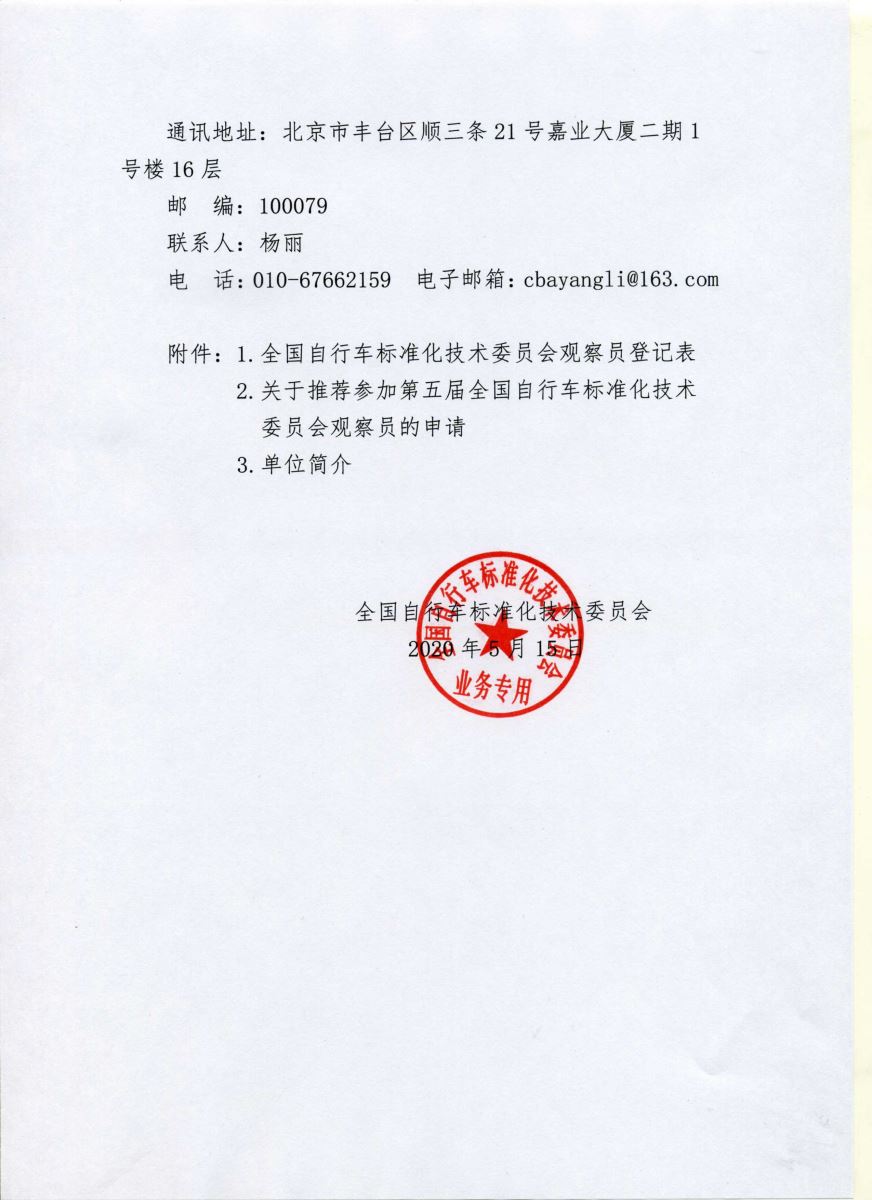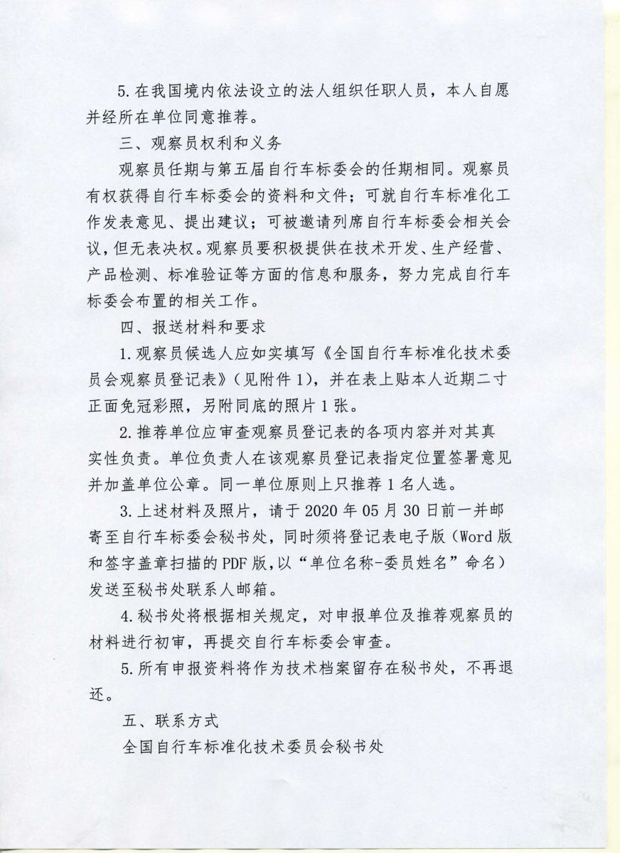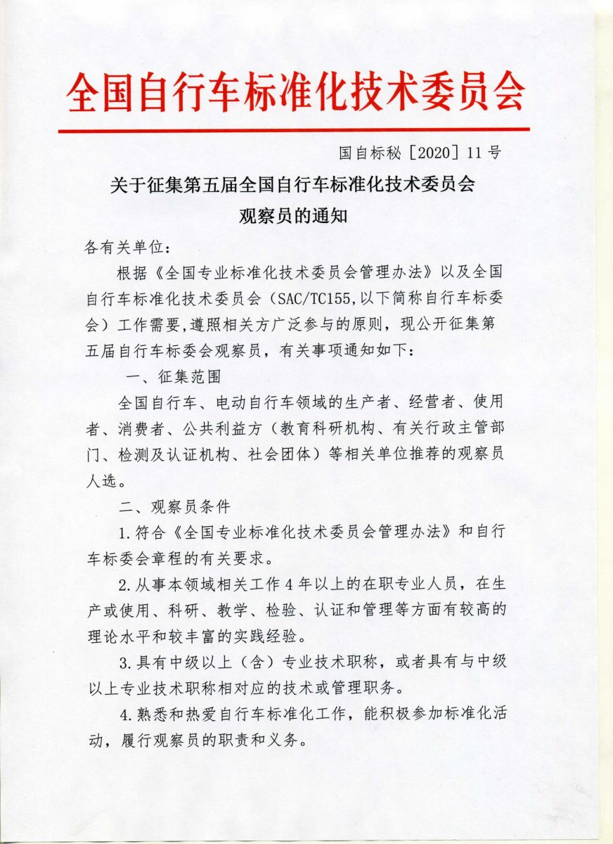 关于征集第五届全国自行车标准化技术委员会观察员的通知 来源:中自协 作者:技术标准部 发布时间:2020-05-18 16:11 附件:1.全国自行车标准化技术委员会观察员登记表 2.关于推荐参加第五届全国自行车标准化技术委员会观察员的申请 3.单位简介 摘编:中自协; 摘编日期:2020-5-18