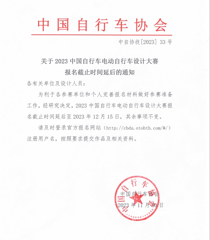 关于2023中国自行车电动自行车设计大赛报名截止时间延后的通知