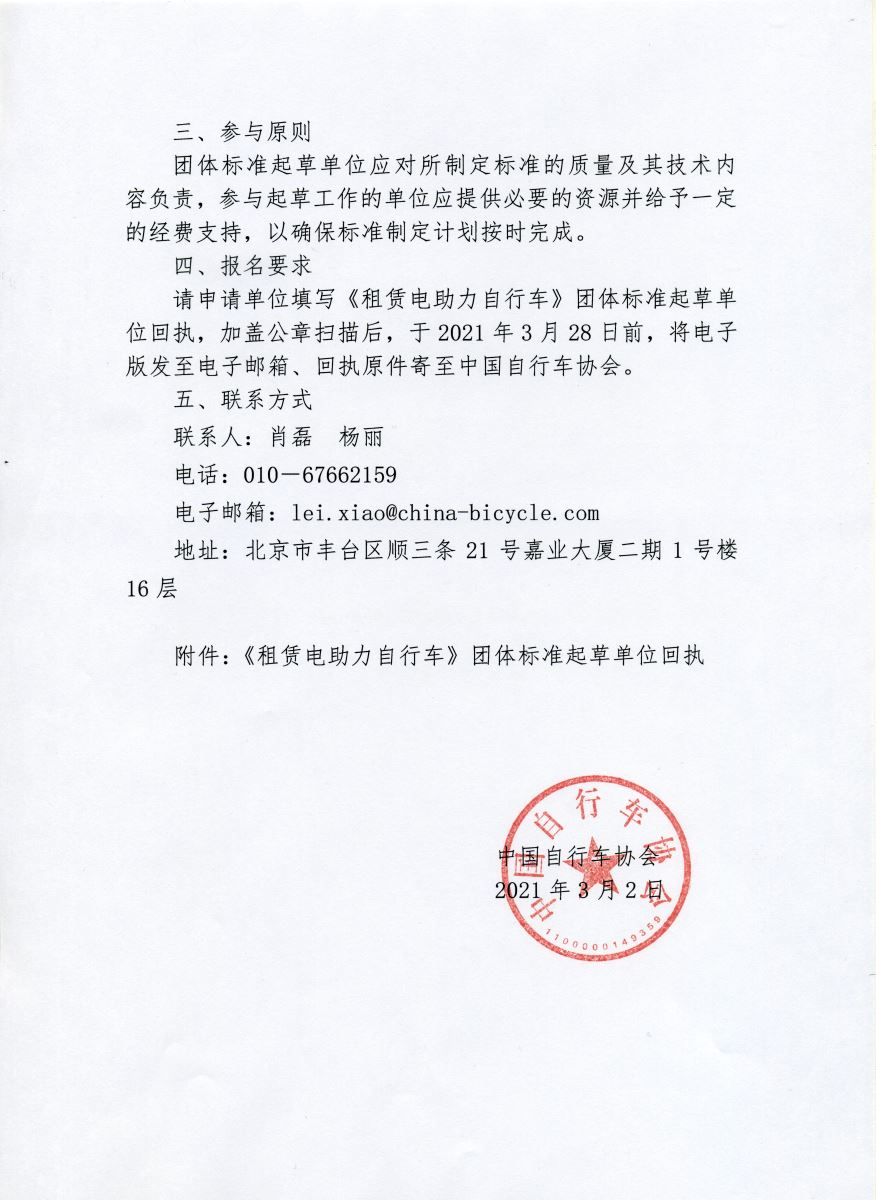 关于征集《租赁电助力自行车》团体标准起草单位 和起草人的通知