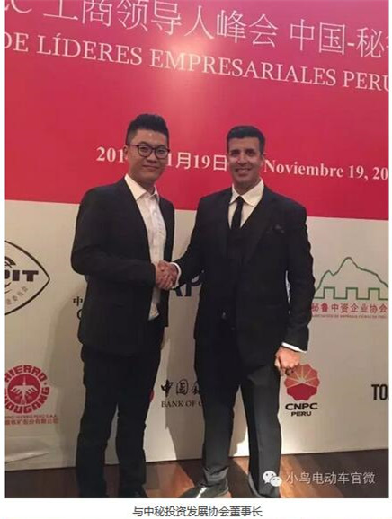 2016年11月19日,2016年亚太经合组织工商领导人峰会在秘鲁利马举行。会议围绕全球经济和贸易状况、创新和可持续经济发展、促进人类发展等议题展开讨论。习近平、普京、奥巴马等主要国领导人出席这次峰会,国家主席习近平在峰会上发表了主旨演讲。中国400多名企业领导人出席为期2天的工商领导人峰会。小鸟车业总经理张乾作为中国电动车行业的唯一代表,应邀出席了本次峰会。