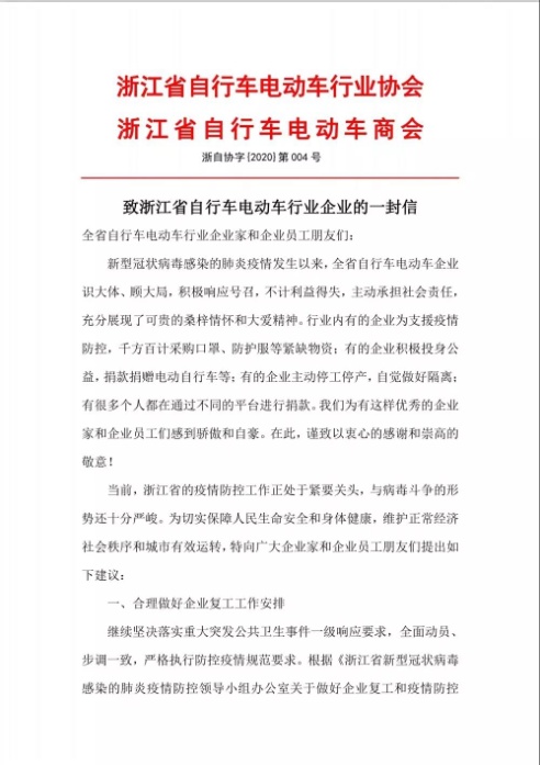 新型冠状病毒肺炎的疫情牵动着每一个国人的心,而此次疫情对自行车、电动自行车行业将产生深刻的影响。为了减少人员聚集和交叉感染,阻断疫情传播,早前就有专家、人民日报建议,少坐公交,骑自行车、电动自行车出行。事实上,对无私家车一族来说,自行车和电动自行车恐怕是广大市民使用最多的交通工具。我们呼吁有关部门能对电动自行车这项老百姓依赖的交通工具给予更多的出行空间,特殊时期放宽电动自行车出行管理。