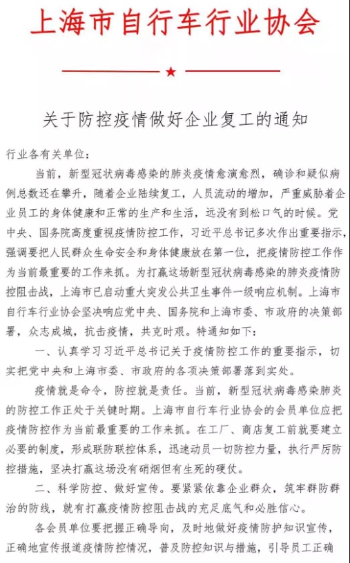 在自行车、电动自行车的需求量和使用量都将增长的情况下,请行业各生产单位和经销商做好电动自行车的供应和维修的准备工作。与此同时,疫情防控工作正处于紧要关头,与病毒斗争的形势还十分严峻,行业企业一定要合理做好企业复工工作安排,严格执行防控疫情规范要求,切实落实企业疫情防控主体责任。