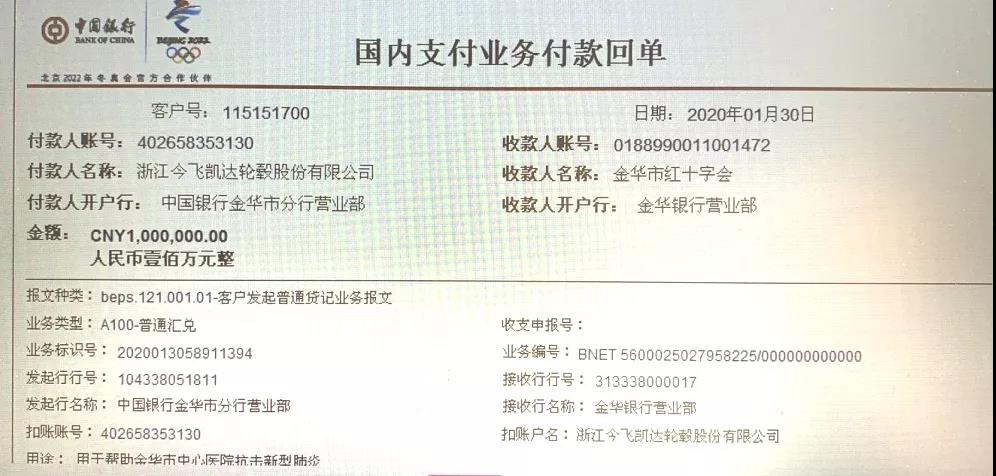 疫情牵动人心,行动彰显担当!1月30日,在全国上下共同防控抗击新型冠状病毒肺炎疫情关键之际,浙江今飞凯达轮毂股份有限公司向金华市红十字会捐款人民币100万元,用于疫情的防控和感染人员的救治。