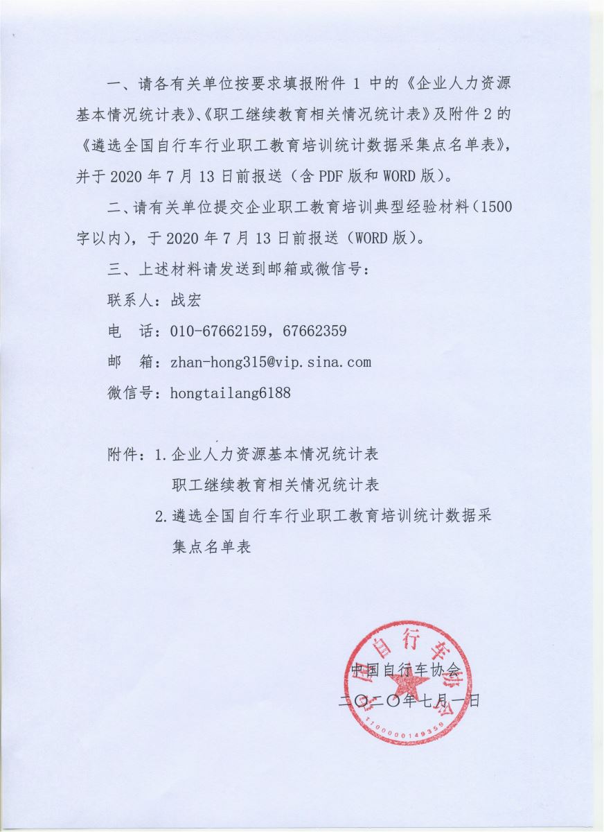 关于做好2019年全国自行车行业职工教育培训统计工作的通知 来源:中自协 作者:综合业务部 发布时间:2020-07-15 13:07 附件:1.企业人力资源基本情况统计表,职工继续教育相关情况统计表 2.遴选全国自行车行业职工教育培训统计数据采集点名单表 摘编:中自协; 摘编日期:2020-7-1