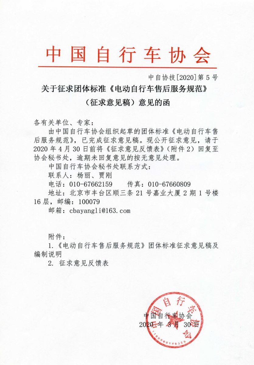 关于征求团体标准《电动自行车售后服务规范》(征求意见稿)意见的函 来源:中自协 作者:技术标准部 发布时间:2020-03-30 15:38 附件:1.《电动自行车售后服务规范》团体标准征求意见稿 2.《电动自行车售后服务规范》团体标准征求意见稿编制说明 3.征求意见反馈表 摘编:中自协; 摘编日期:2020-3-30
