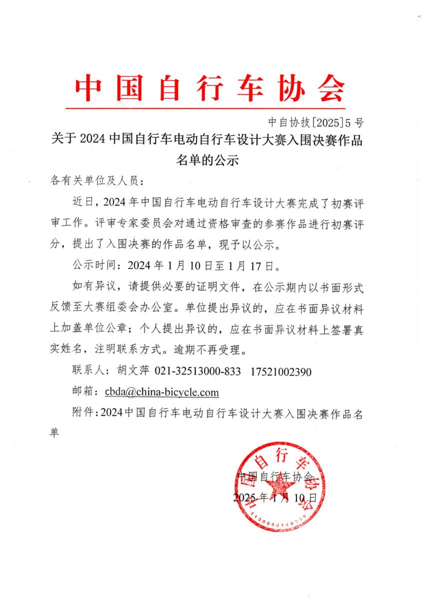 关于2024中国自行车电动自行车设计大赛入围决赛作品名单的公示