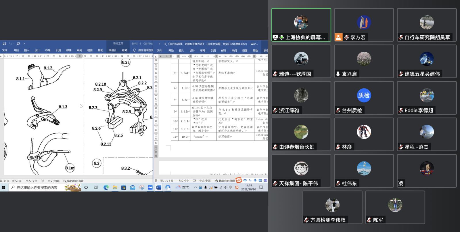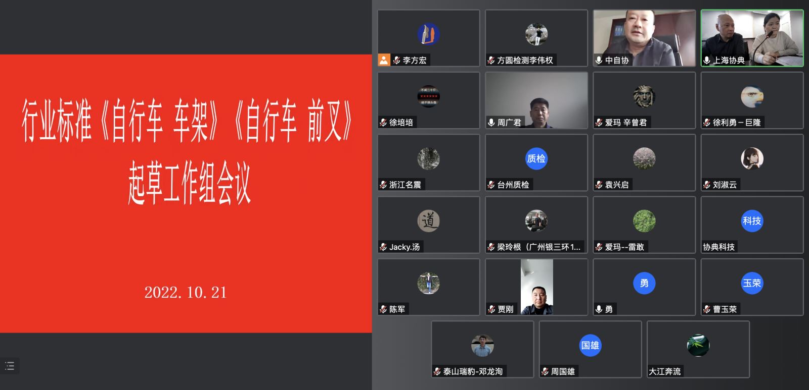 全国自行车标准化技术委员会组织的推荐性国家标准《自行车部件分类、名称和主要术语》以及行业标准《自行车车架》《自行车前叉》《自行车表面涂层技术条件》起草工作组会议分别于10月19日至21日以视频会议的形式顺利召开。