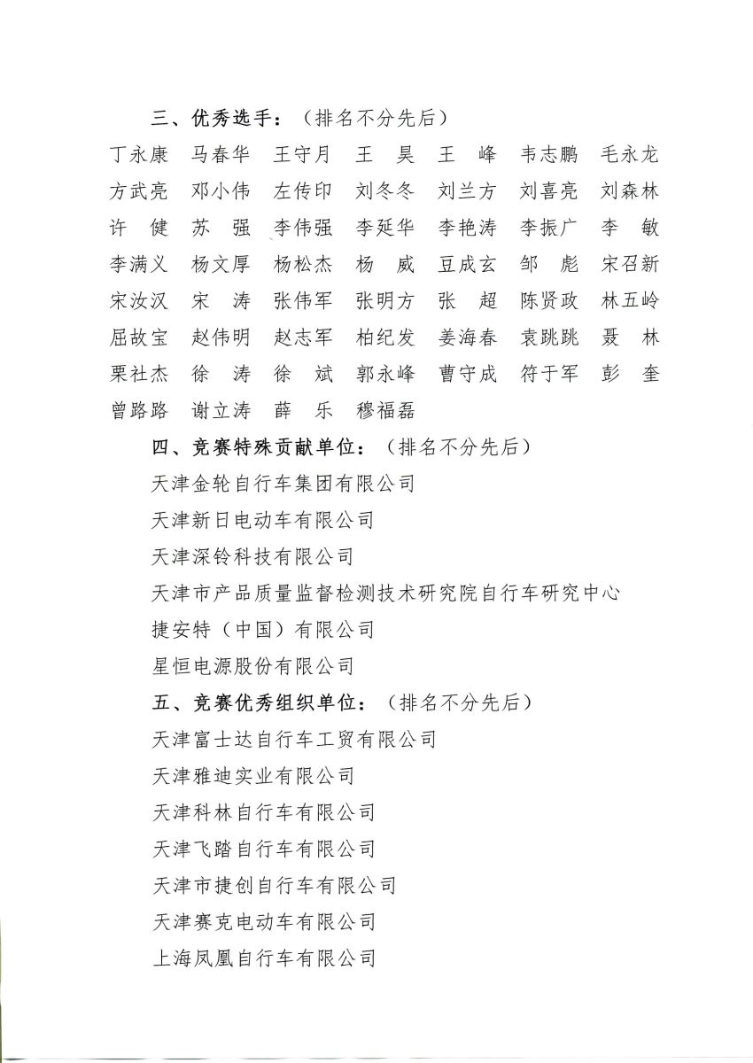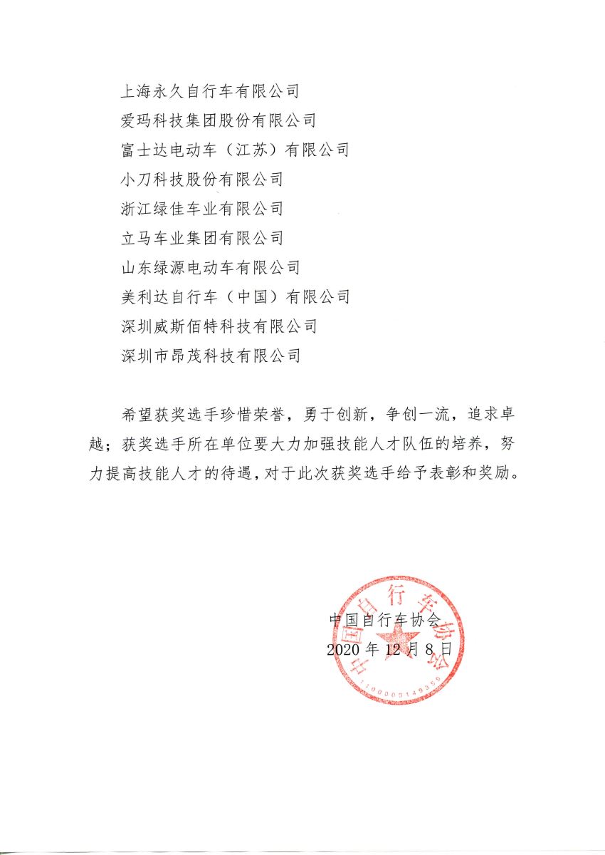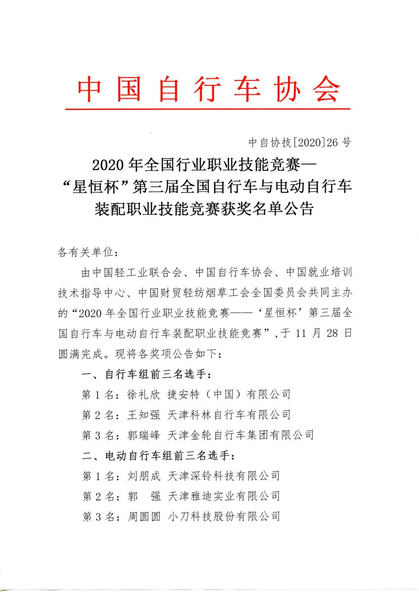 2020年全国行业职业技能竞赛— “星恒杯”第三届全国自行车与电动自行车 装配职业技能竞赛获奖名单公告