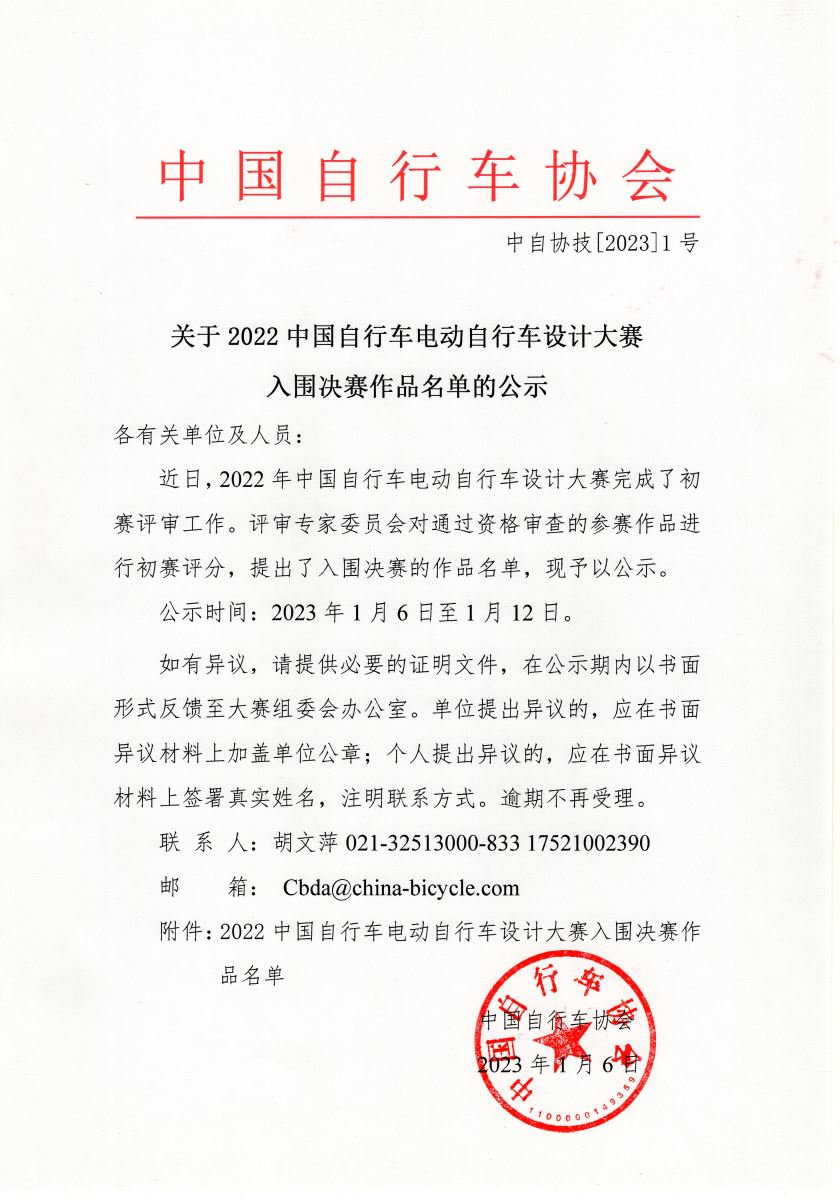 关于2022中国自行车电动自行车设计大赛入围决赛作品名单的公示