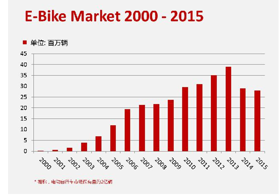 上图是电动自行车从2000年到2015年的市场规模变化情况。电动自行车经过多年的发展,已发展成为一个成熟的市场,每年的增量在减少,尤其是从2014年开始,市场增长明显下降了。但其市场基本的需求面还是巨大的,市场增长规模也还是2千万级别的。