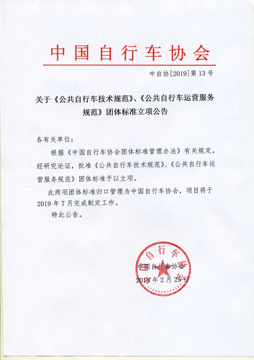 关于《公共自行车技术规范》、《公共自行车运营服务规范》团体标准立项公告