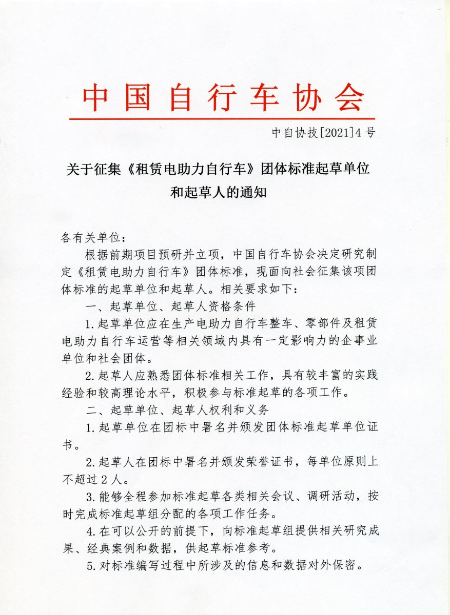 关于征集《租赁电助力自行车》团体标准起草单位和起草人的通知