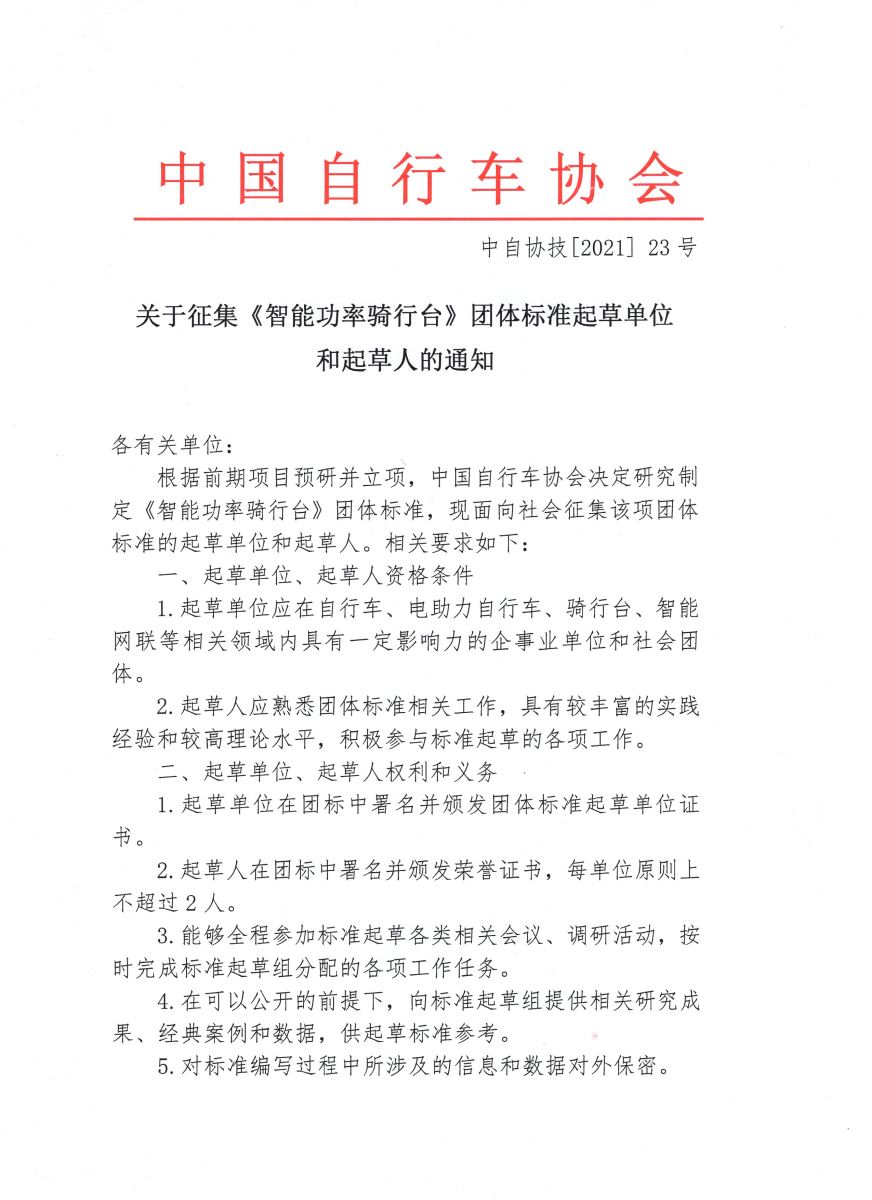 关于征集《智能功率骑行台》团体标准起草单位和起草人的通知
