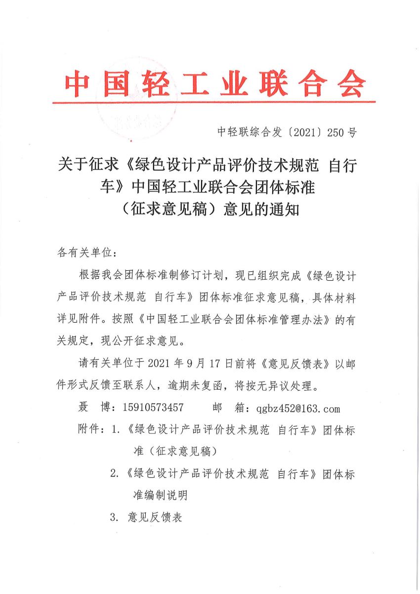 关于征求《绿色设计产品评价技术规范 自行车》中国轻工业联合会团体标准(征求意见稿)意见的通知 来源:中自协 作者:技术标准部 发布时间:2021-08-17 15:11 附件:1.征求意见稿 2.编制说明 3.意见反馈表